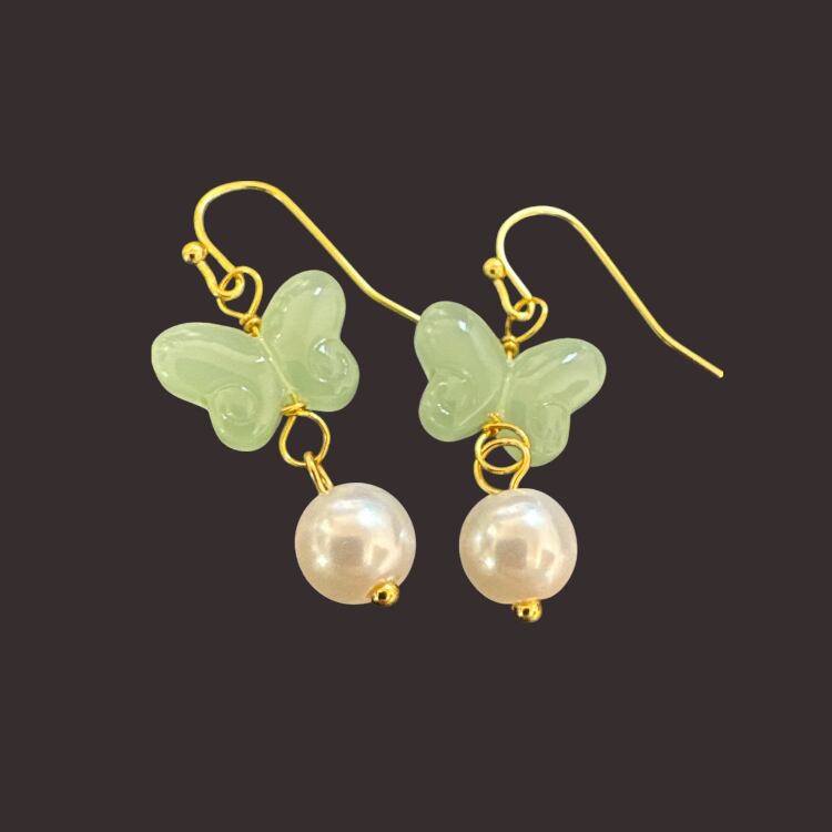 b-0313 揺れるパールビーズが可愛い蝶々フックピアス ちょうちょ ピアス 人工和田玉 フックピアス グリーン ゴールド