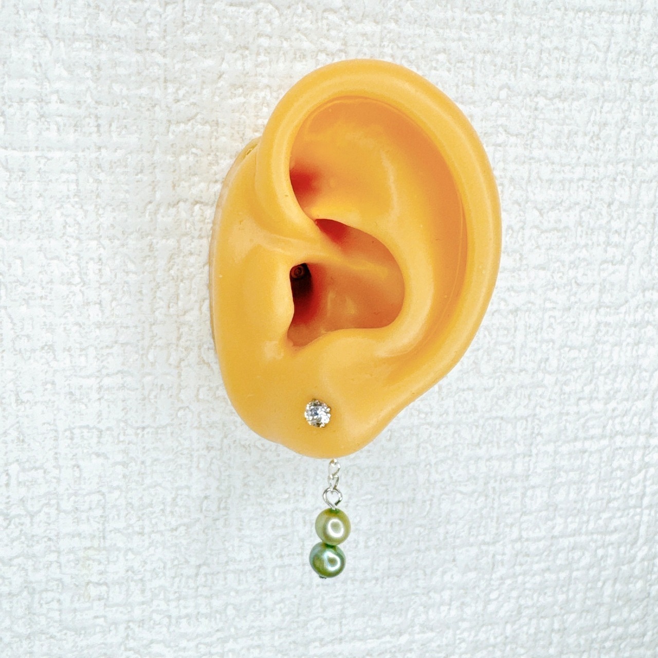 ウグイスのような色合いを染色したパールです。染色パールという特徴を活かした美しさをピアスキャッチで表現しました。
