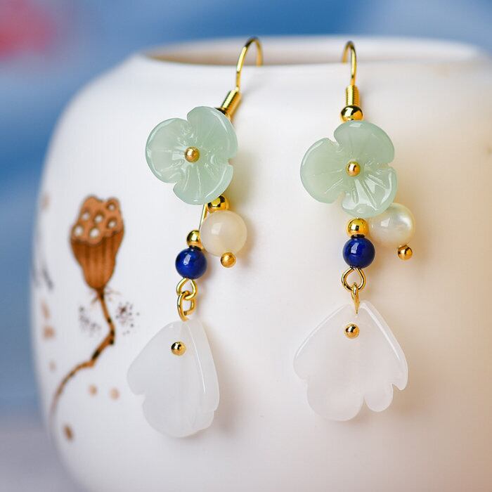 b-0353 ピアス 花 フラワー ゴールド フック 小さい 淡水パール グリーンメノウ 中国風 20G 仕事用 揺れる シンプルピアス ゆらゆら フックピアス